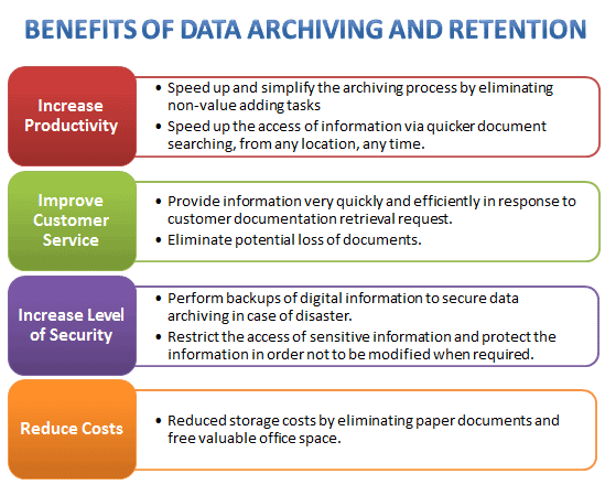 The main reasons for implementing a data archiving system, is to comply with the government regulations. These generally require a business to retain key business information. Failure to comply can result in large fines or sanctions.